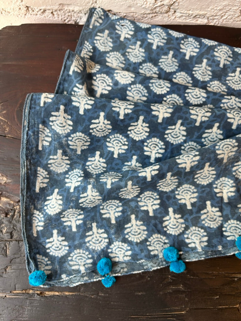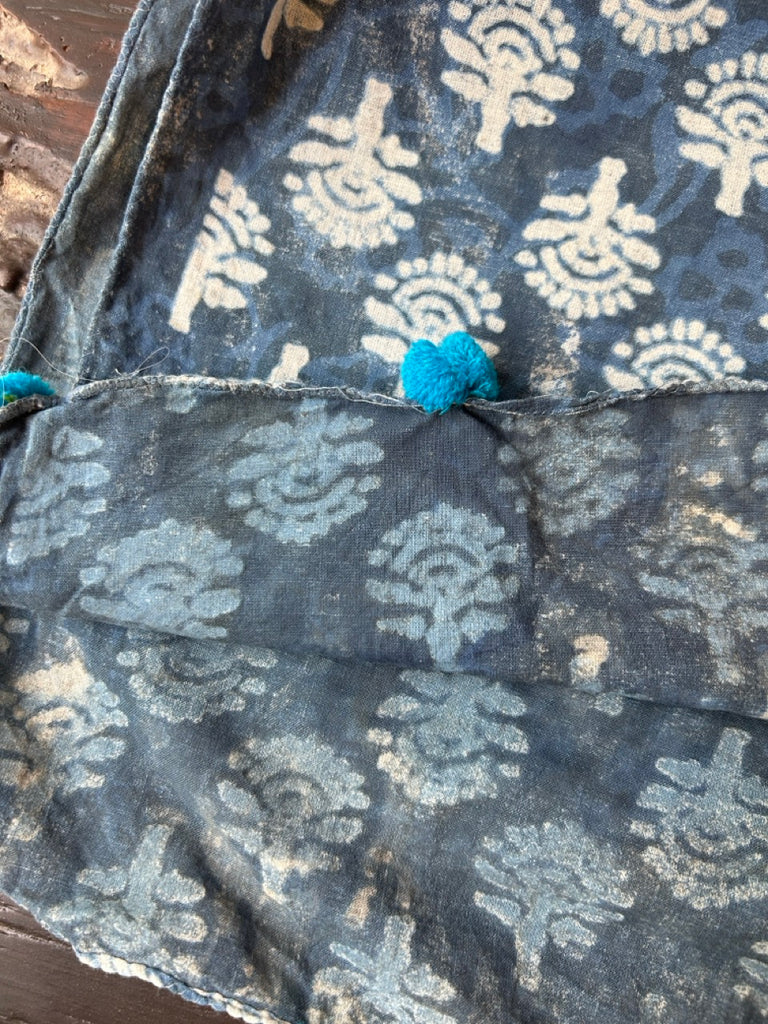 ブロックプリント ポンポン付きストール ブルー htm150422