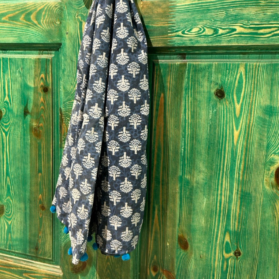 ブロックプリントのストールにポンポンがついた大人かわいい1枚です